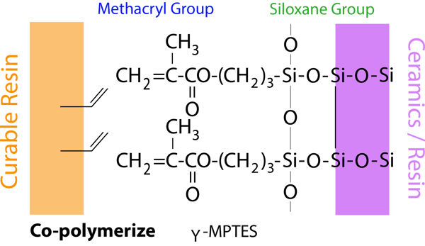 The alkoxy group in γ-MPTES reacts with water to form a silanol group. Next, a siloxane bond is formed by a dehydration and condensation reaction with the silanol group on the ceramic surface. Additionally, the methacryl group co-polymerizes with monomers in dental curable materials. Since the new silane coupling agent, γ-MPTES, is more stable in the bottle than the conventional one (γ-MPS), the adhesion effect lasts for a long time.